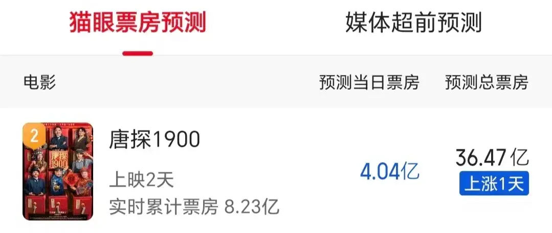 截至發稿前,上映不到兩天的《唐探1900》總票房已達8.23億。據貓眼專業版數據,《唐探1900》的預測總票房為36億+,這意味着唐探系列總票房將累計超120億,成為國內影史首個破百億且不止百億的電影IP。《唐探》的票房號召力有多強,由此可見一斑。