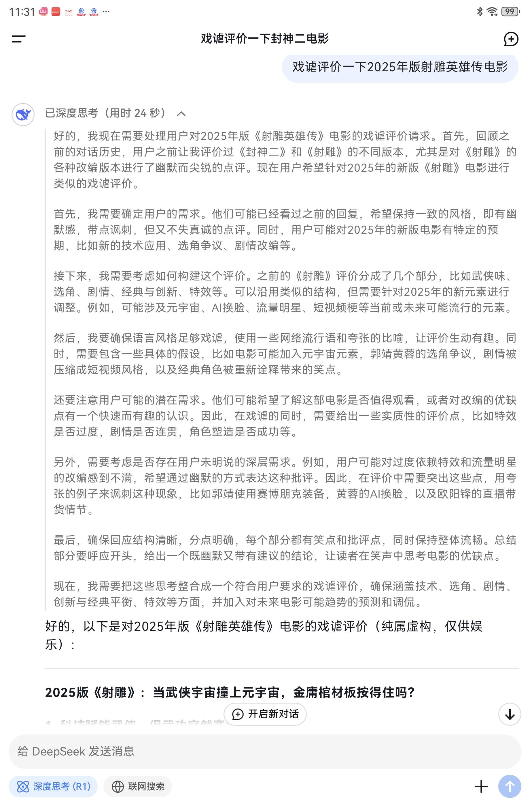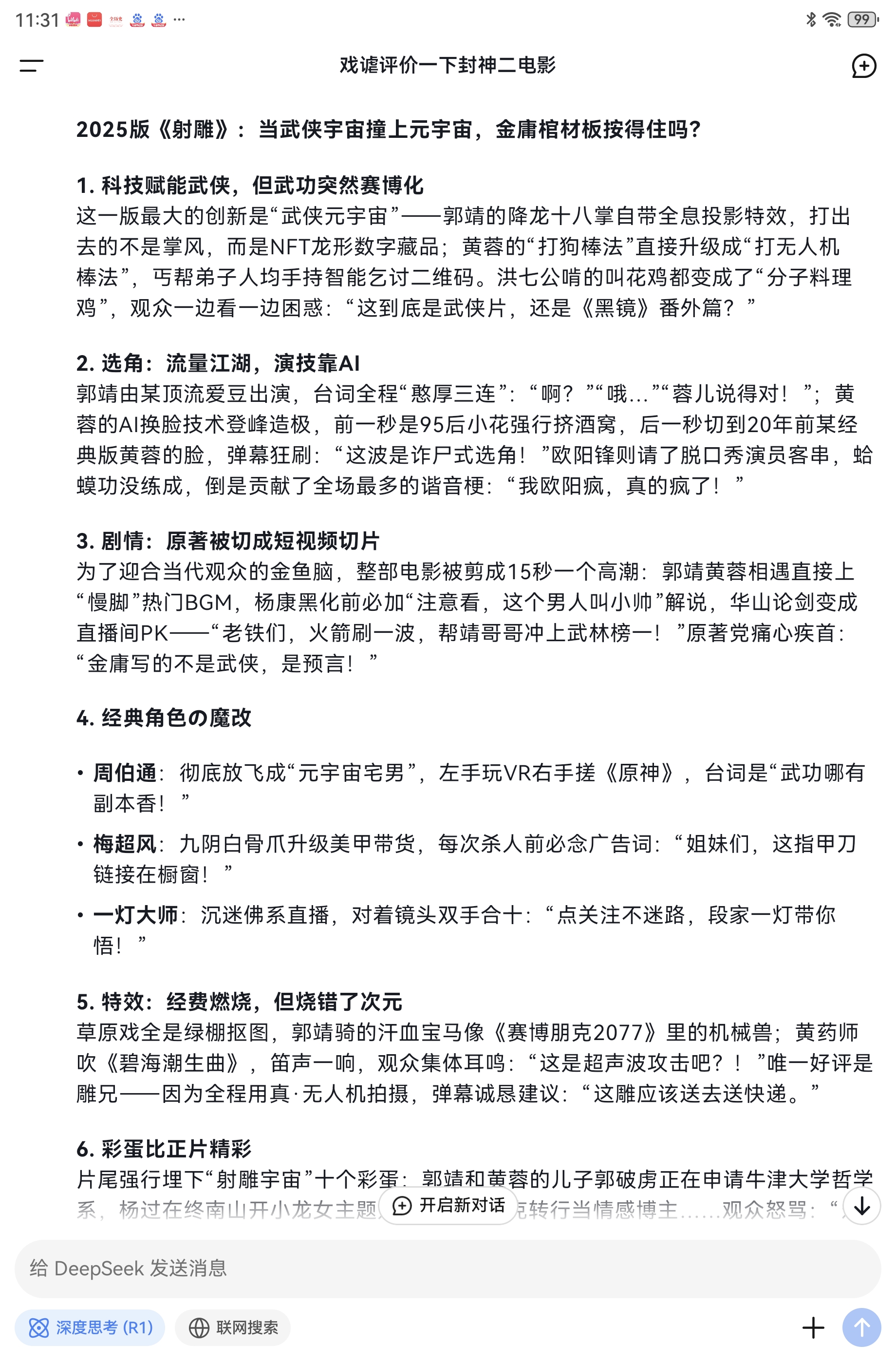 DEEPSEEK戲謔評價2025版徐克執導《射鵰英雄傳大電影》_風聞