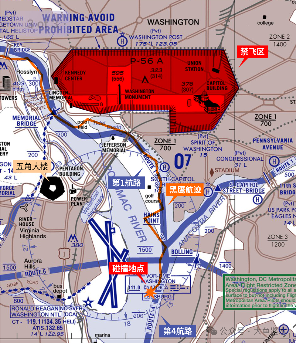 將黑鷹的航跡疊加到里根機場航圖上,可以看出黑鷹基本沿着第1航路 - 第4航路的飛行走廊飛行,但航向相當不穩定,經常會飛出直角拐彎。按規定這條航線的飛行高度在200英尺(60.96米)以下。