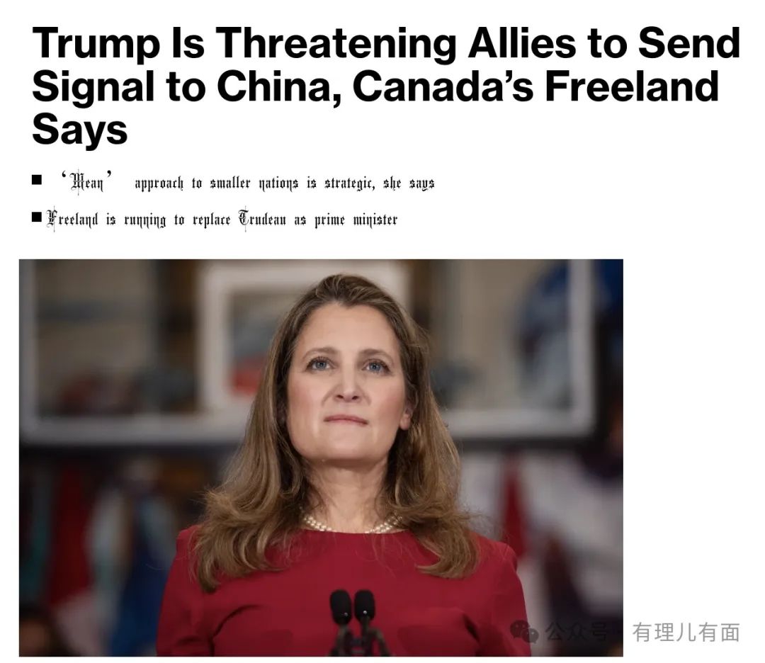 當地時間1月29日,美媒彭博社報道,加拿大總理候選人,前財政部長克里斯蒂婭·弗裏蘭發表了一番堪稱“驚世駭俗”的言論。她聲稱特朗普威脅對加拿大、墨西哥以及其他盟友徵收鉅額關税,實則有着“良苦用心”,是為了接下來的對華強硬政策做鋪墊。