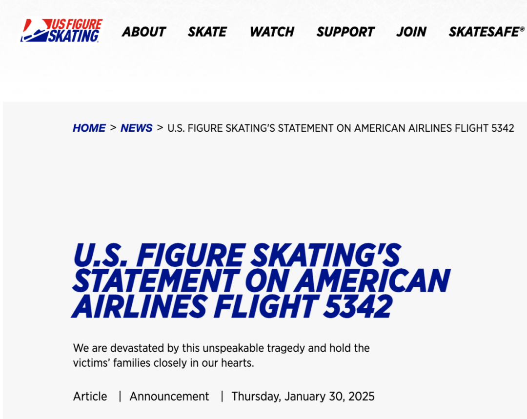 這份聲明中寫道:“這些運動員、教練和家人剛從堪薩斯州威奇塔舉行的與美國花式滑冰錦標賽聯合舉辦的國家發展訓練營返回家中。這場無法形容的悲劇讓我們深感悲痛,我們深切哀悼遇難者家屬。我們將繼續關注事態發展,並將及時發佈更多信息。”