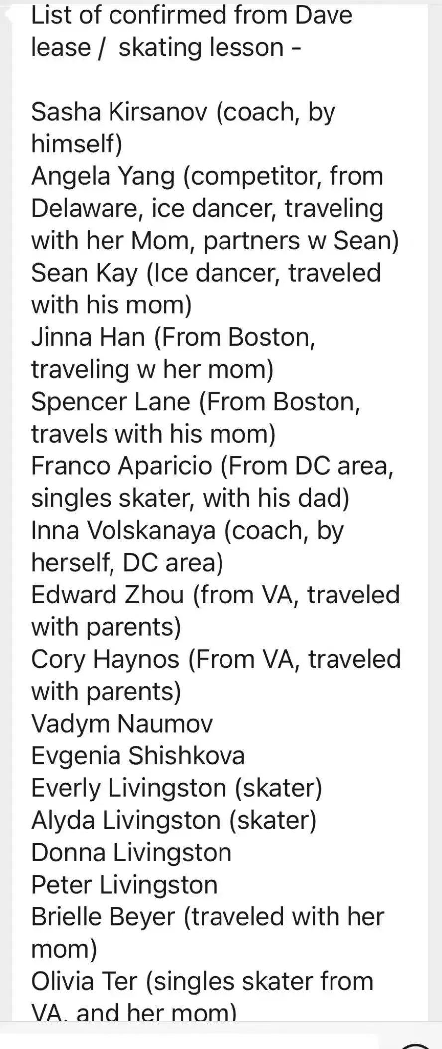 美國花樣滑冰協會表示,他們剛從國家發展營返回,這是一個為有前途的年輕運動員舉辦的高級訓練營,與美國花樣滑冰錦標賽同時舉行。這些運動員是參加下一屆冬季奧運會的美國代表隊精英,這次事故對美國花滑隊是毀滅性的打擊。
