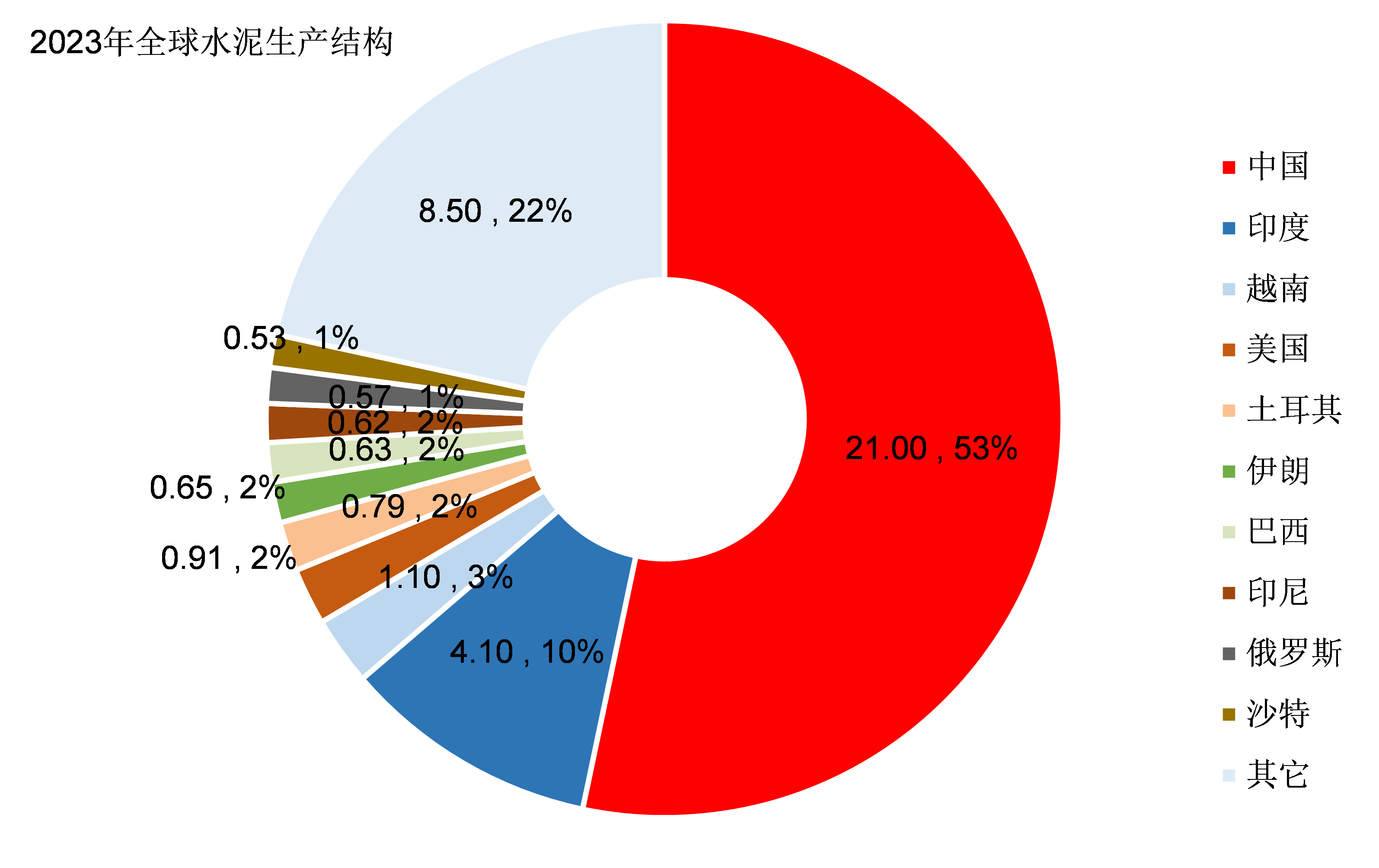 2023年全球水泥產量是41億噸,中國以21億噸(數據來源:USGS美國地質調查局)的產量在全球水泥總產量中的佔比達到53%。