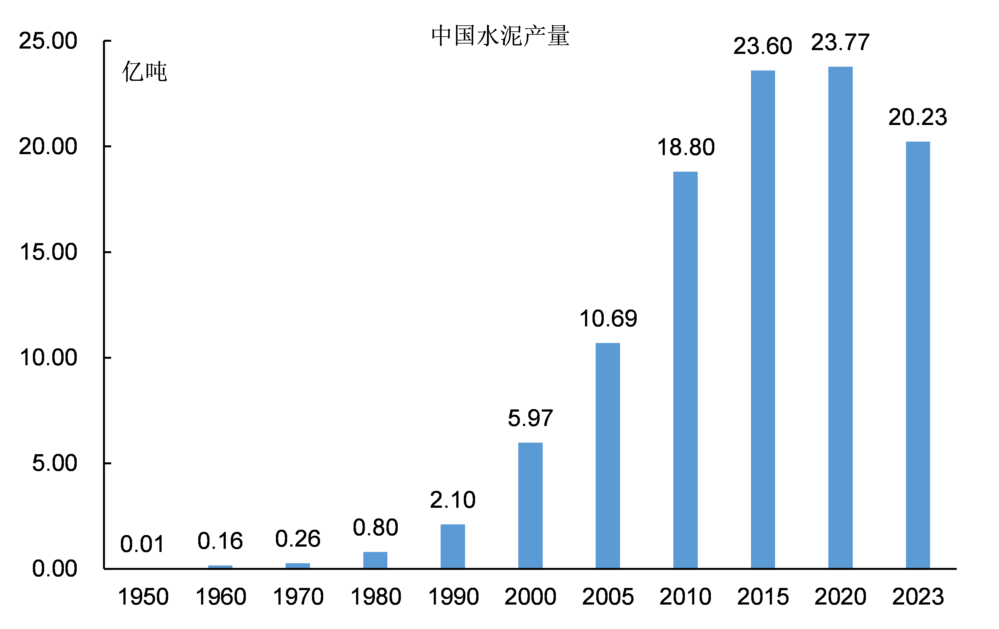 2020年,中國水泥產量達到23.8億噸。從2011年到2023年,中國水泥產量都維持在20億噸之上,這是人類歷史上從未達到的高度。