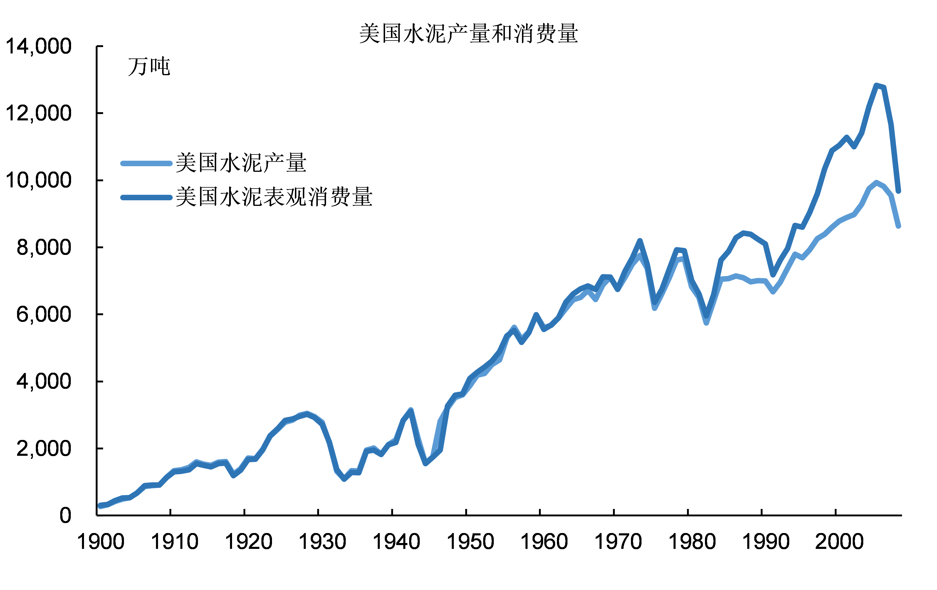 從1900年至今,美國的水泥產量從未超過1億噸,只在2003年後的少數時間內達到9000萬噸的水平之上。