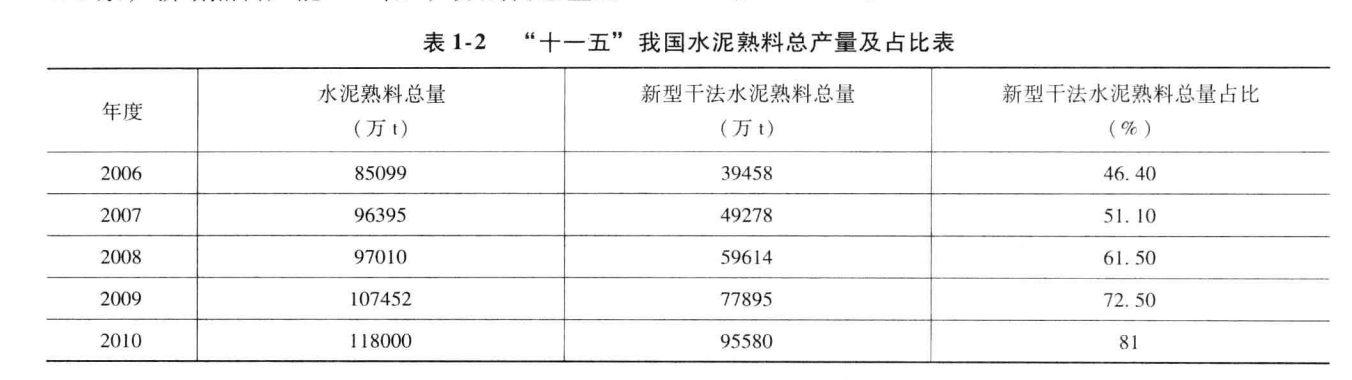 2005年中國新型幹法水泥熟料產量達到3億噸,佔水泥熟料的比例為38.6%; 2010年新型幹法水泥熟料產量佔水泥熟料的比例進一步超過80%。