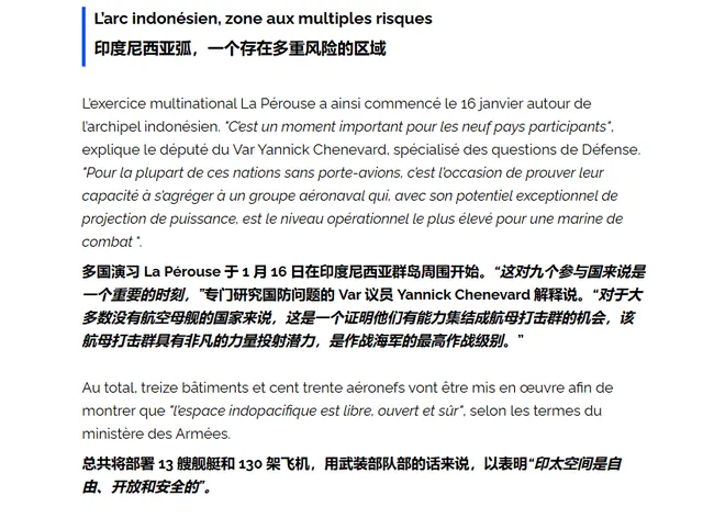 根據法國國防部的説法,總共將有13艘艦艇和130架飛機參與“拉佩魯茲”演習。法國人之所以大老遠跑過來拉幫結夥,目的是向世人展示“印太地區是自由、開放且安全的,而法國海軍來到這裏就是為了確保這一點”。