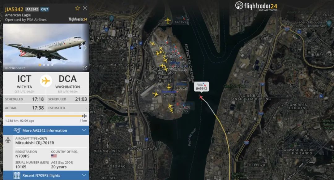 我們可以來一一回答,在事發時,美國之鷹航空AA5342次航班正在執行從美國中部堪薩斯州威奇托到美國首都華盛頓的飛行任務,使用的飛機是一架美國之鷹航空的龐巴迪CRJ-700-ER型支線客機,註冊號為N709PS。