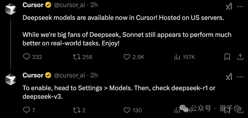 繼微軟前腳指指點點,後腳就在自家AI平台上接入了DeepSeek模型之後,程序員們最愛的Cursor今天也最新宣佈: