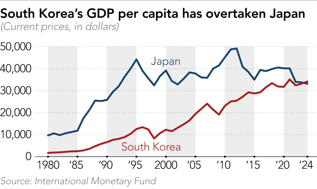 別看才多出這麼一點點,這卻是個歷史性的轉折點,因為兩國自從1980年,開始搞對比統計以來,這是韓國人均GDP,首次超過日本!、