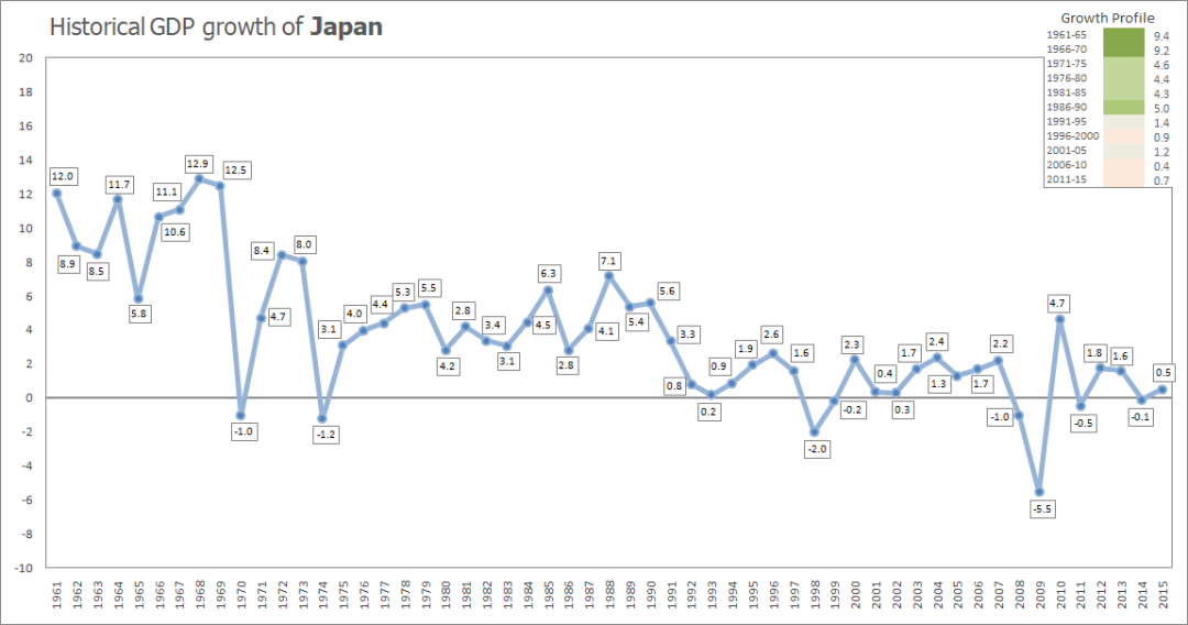 日本歷年GDP增長速度,能明顯看出1990年代起,它就不行了。