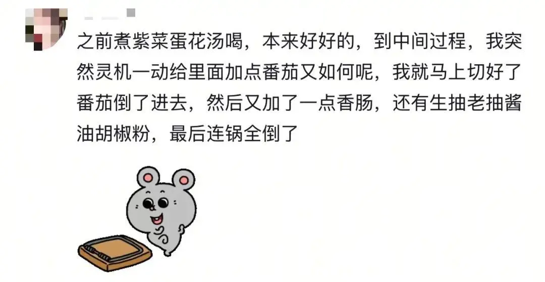 有人辣評道,家裏沒鹽了就倒醬油代替,圓葱和大葱混着用,甚至做一道可樂雞翅都要想着能不能換雪碧試試,你能成功才怪呢。