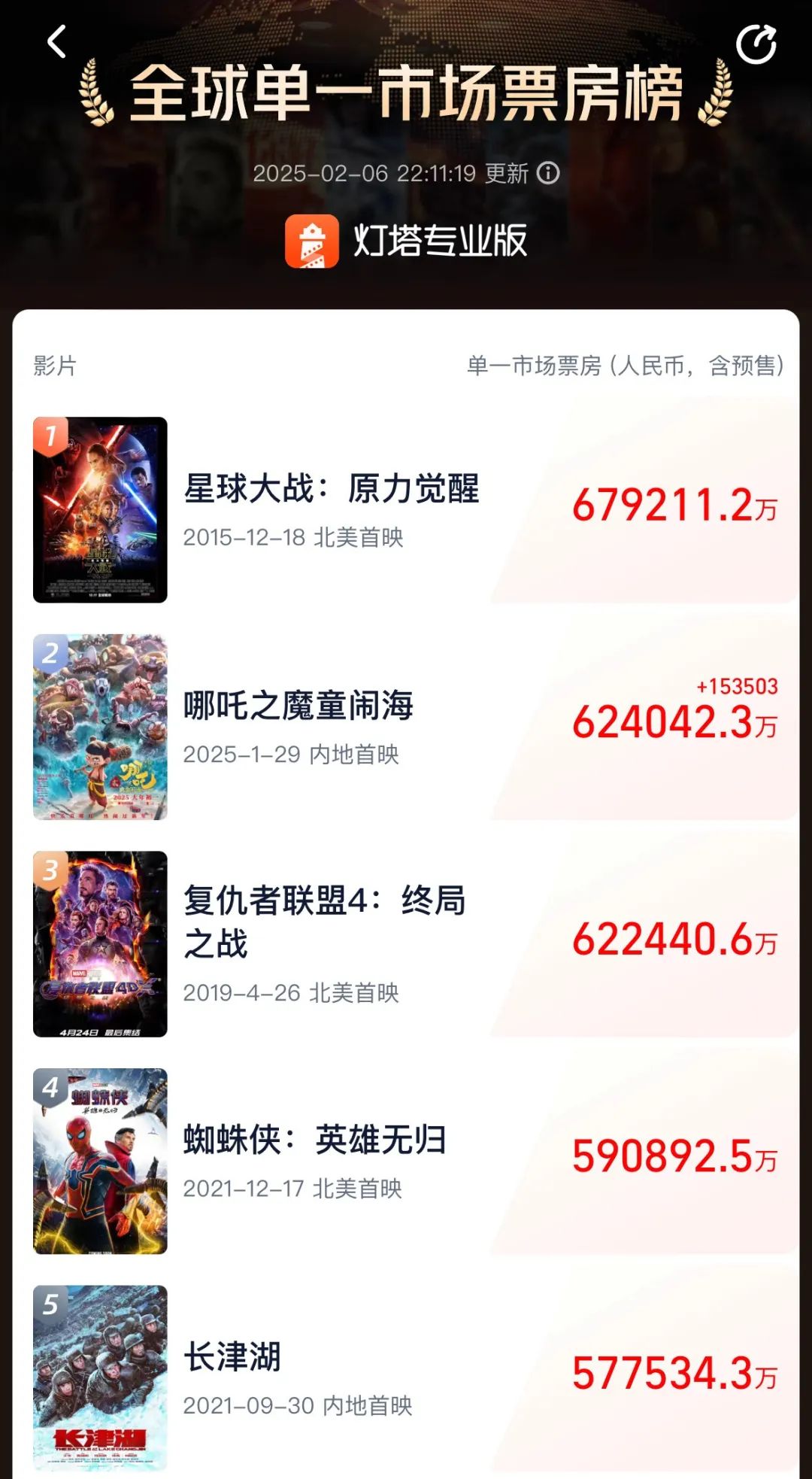 其中《哪吒之魔童鬧海》以48.39億的票房拿下檔期冠軍,並在檔期結束後的2月6日拿下國內影史票房冠軍,同時超越《復仇者聯盟4:終局之戰》在全球單一市場票房榜上位居第二,僅次於《星球大戰:原力覺醒》。目前來看,《哪吒之魔童鬧海》登頂榜一隻是時間問題。