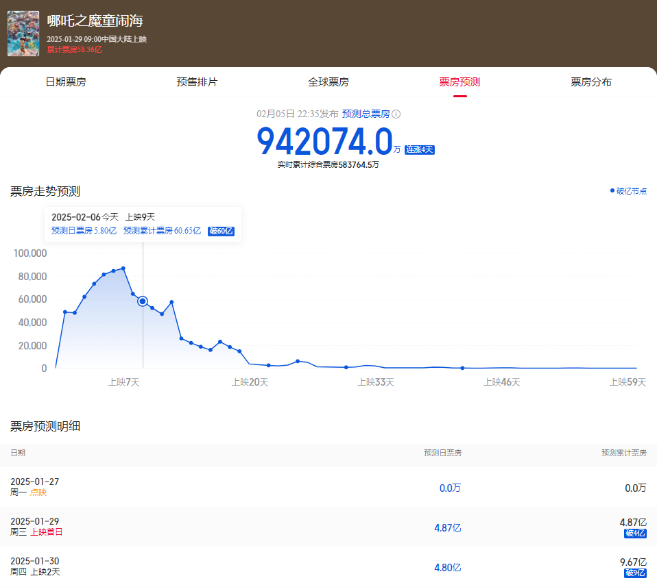 隨着元宵節臨近,有專業機構預測,《哪吒2》票房將保持強勁增長勢頭,據貓眼專業版票房預測,其總票房有望超過94.2億元。結合第一部《哪吒之魔童降世》的50.35億票房,這也意味着《哪吒》系列電影將成為百億票房IP。