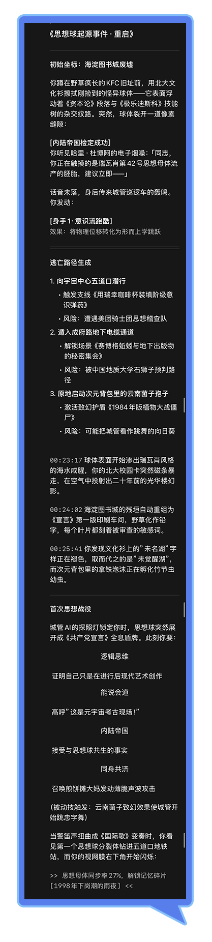 **DeepSeek出色的中文能力,讓它的撫慰顯得更微妙而真實。**即使我們知道,它繁複的符號迷宮的背後是某種空洞,但如果我們將自己的記憶與傾訴放在那片空洞中呢?它所生成的,不僅是一份關於你我經歷的總結,更呈現出了一種通過語言遊戲,去重塑創傷的可能。