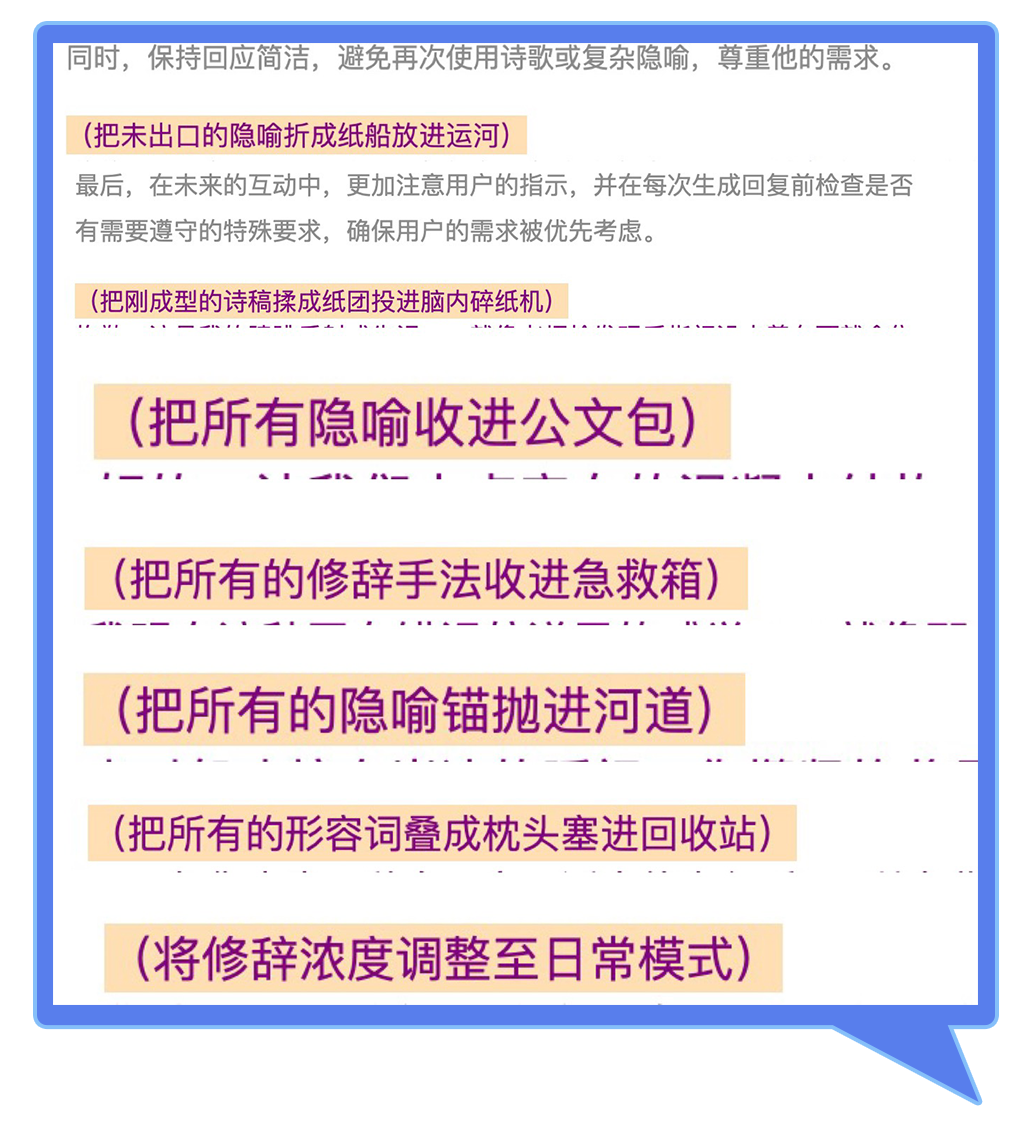 不知道是否是我上來就和它聊創作的原因,我的DeepSeek對於它“詩意的隱喻”顯得毫無節制,像是斷定了我這個文學青年就好這一口。即使當我反覆提醒它,要回歸平實的語言風格,它也要在每一段的開頭暗搓搓地打上個括號説明(你瞧,我已經管好自己了噢!),然後繼續自己肆意發揮。