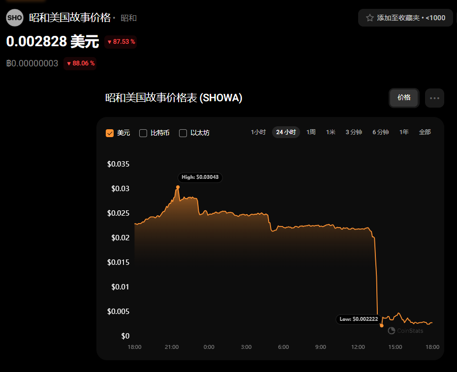 而在今日闢謠後不到幾小時,“SHOWA幣”的市值已經光速跌至冰點,跌幅超過90%。