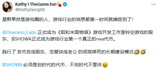 2月6日,一則關於《昭和米國物語》的消息在網上流傳開來:一家名為Oneness Labs的加密貨幣發行商聲稱自己收購了開發商鈴空遊戲的部分股權,並推出《昭和米國物語》相關主題的加密貨幣$SHOWA。
