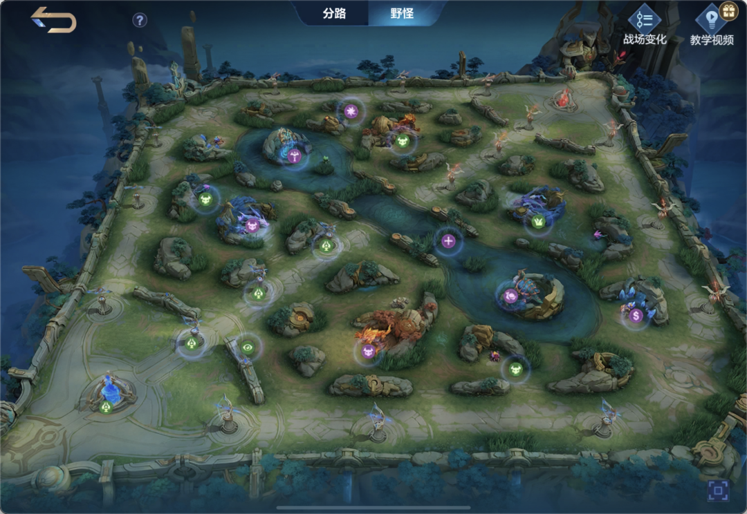 地圖由三條路組成,位置劃分也是上單打野中單下路雙人組那一套,防禦塔的佈局也和王者一毛一樣,水晶位置也沒有門牙塔,買裝備也不用回家。。。