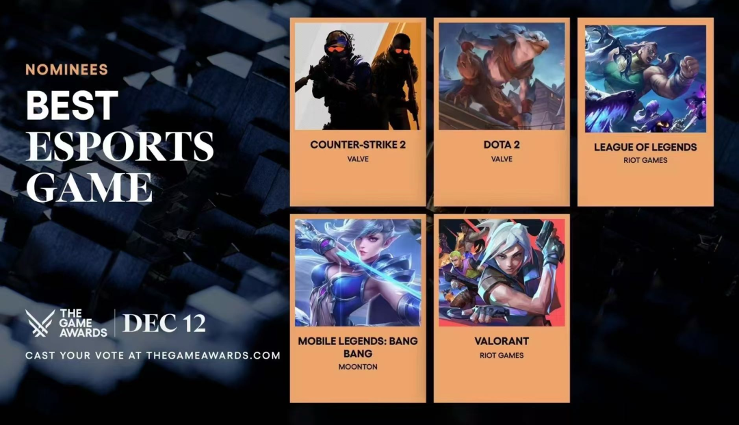 你看看和它爭奪獎項的那幾位, CS 、刀塔 2 、 LOL 、無畏契約,就知道《 決勝巔峯 》大概有多火了。
