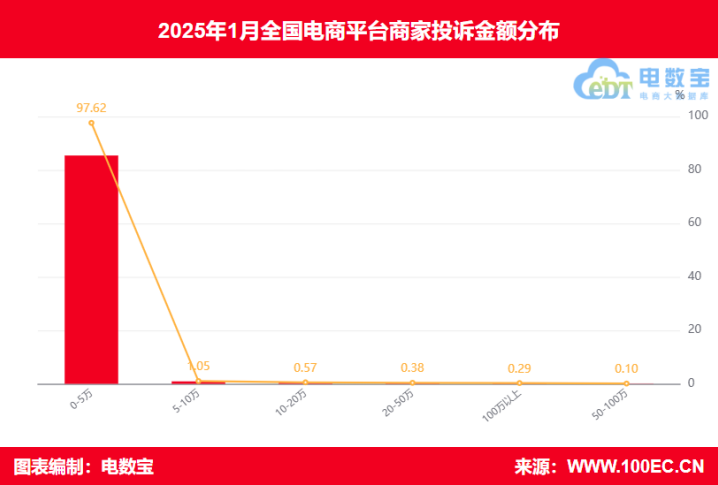 據“電訴寶”顯示,1月商家投訴金額分佈主要集中在0-5萬(97.62%)、5-10萬(1.05%)、10-20萬(0.57%)、20-50萬(0.38%)、100萬以上(0.29%)、50-100萬(0.10%)。