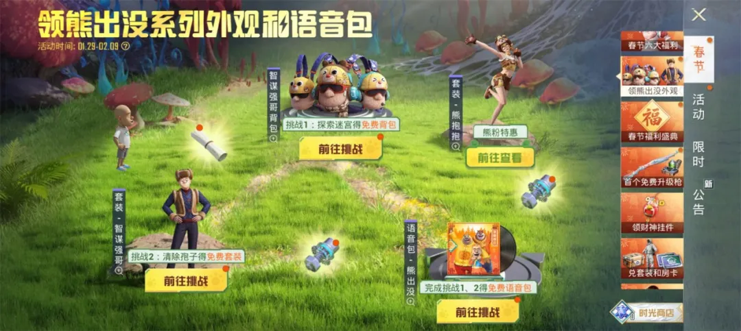 在輻射泛玩家羣體方面,《和平精英》在春節期間也是動作不斷。比如遊戲與《熊出沒》聯動推出了系列外觀與語音包(活動持續至2月9日)。這一聯動喚起的不僅是從小看着《熊出沒》長大的玩家的情懷童心,也精準擊中了部分已經組建家庭帶娃看片的大齡玩家羣體,將他們重新召回到了遊戲之中。