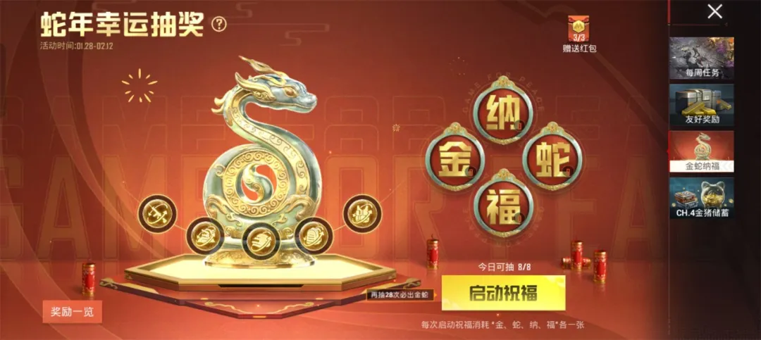 這些上線就能獲取的福利活動既能喚起老玩家的情懷回憶,也能讓春節剛進入遊戲的新玩家快速上手。比如,升級槍“Kar98K-巳巳如意(1級)”不僅可以免費領取,在領取之後還能通過完成每日任務免費升至5級。這一設計不但給了玩家遊戲目標,也讓玩家可以馬上擁有稱手裝備追上大部隊,起到了很好的喚起用户活躍的作用。