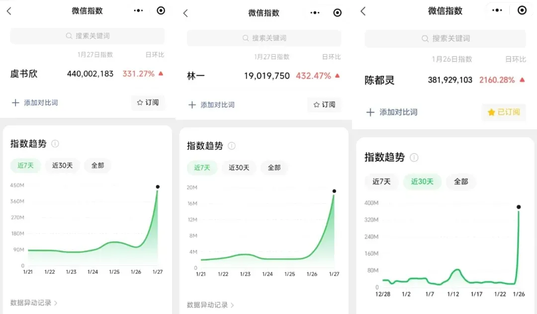 這一合作不但將神裝皮膚融入傳統文化的蛇年生肖主題生動地演繹了出來,也成功喚起了各位明星粉絲對遊戲的關注。虞書欣、林一的CP粉就第一時間趕到評論區大呼磕到了。明星們的微信搜索指數也迎來一波猛漲,實現了與遊戲的雙贏。