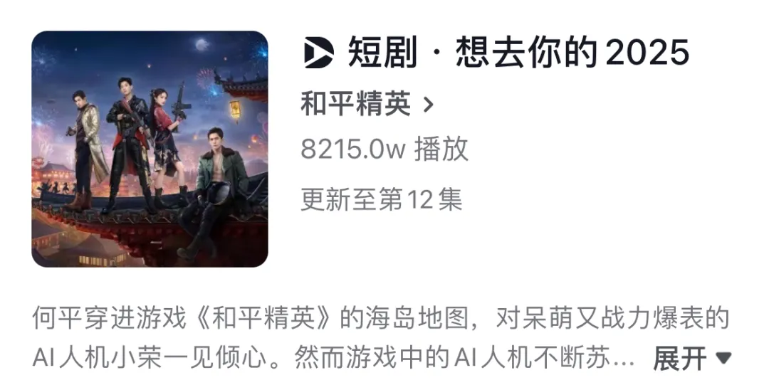另一邊,由王子奇、加奈那主演的《和平精英》首部賀歲短片《想去你的2025》在2月2日上線之後也迅速實現出圈,目前單平台播放量已破8000萬。