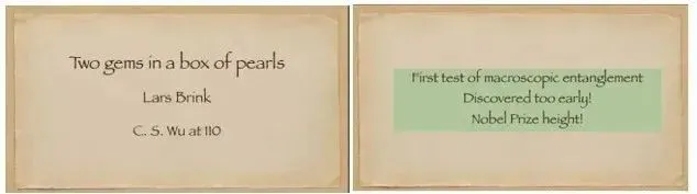 2022年9月24日,美國首都華盛頓的美國國家郵政總局會議大廳。美國物理學會和中國物理學會聯合主辦、全美南京大學校友會承辦的“紀念吳健雄誕辰110週年國際學術論壇”的大會如期進行,拉斯·布林克教授面對幾十萬來自世界各地的科學家、物理愛好者、中學生做了題為“珍珠盒裏兩塊寶石”的演講,揭示了鮮為人知但具有諾貝爾獎高度的實驗成果:1949年,吳健雄與其學生沙克諾夫通過實驗在人類歷史上首次發現了量子糾纏現象。布林克教授同時鄭重評價此事“發現太早”,具有“諾貝爾獎高度”(見下圖)。至此,吳健雄在量子領域所作的卓越貢獻開始逐漸被世人關注。