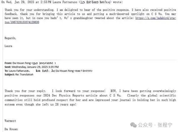 馮達旋在寫給勞拉女士的郵件中寫到:“我收到了關於我們2024年12月刊登的吳健雄相關文章的極為積極的反饋。顯然,全球科學界依然對她懷有深深的敬意,並對貴刊在她離世28年後仍給予如此高度評價她而感到十分欽佩!”