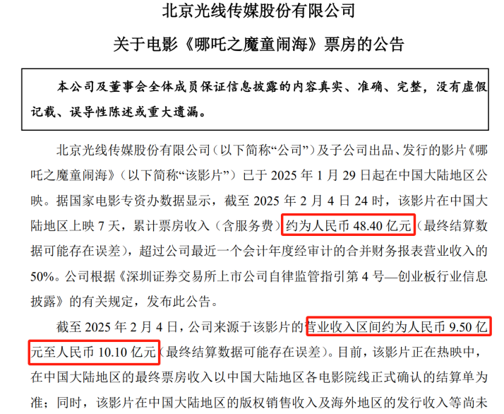 據光線傳媒在2月5日發佈的《哪吒2》票房公告顯示,在《哪吒2》票房為48.4億時,光線的營業收入區間為9.5億-10.1億,超過公司最近一個會計年度經審計的合併財務報表營業收入的50%。若《哪吒2》票房來到100億,光線的營業收入則為20億左右,淨利潤或在15億以上。