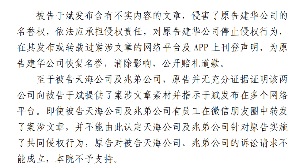 綜上所述,「於見專欄」的這篇文章,雖有一些可能對建華建材帶來不利影響的客觀事實描述與少量的主觀評論表達,但是並未刻意歪曲事實,更不存在惡意抹黑等情況。既然如此,那麼法院最終判決「於見專欄」侵犯建華建材名譽權,顯然也缺乏足夠的依據。