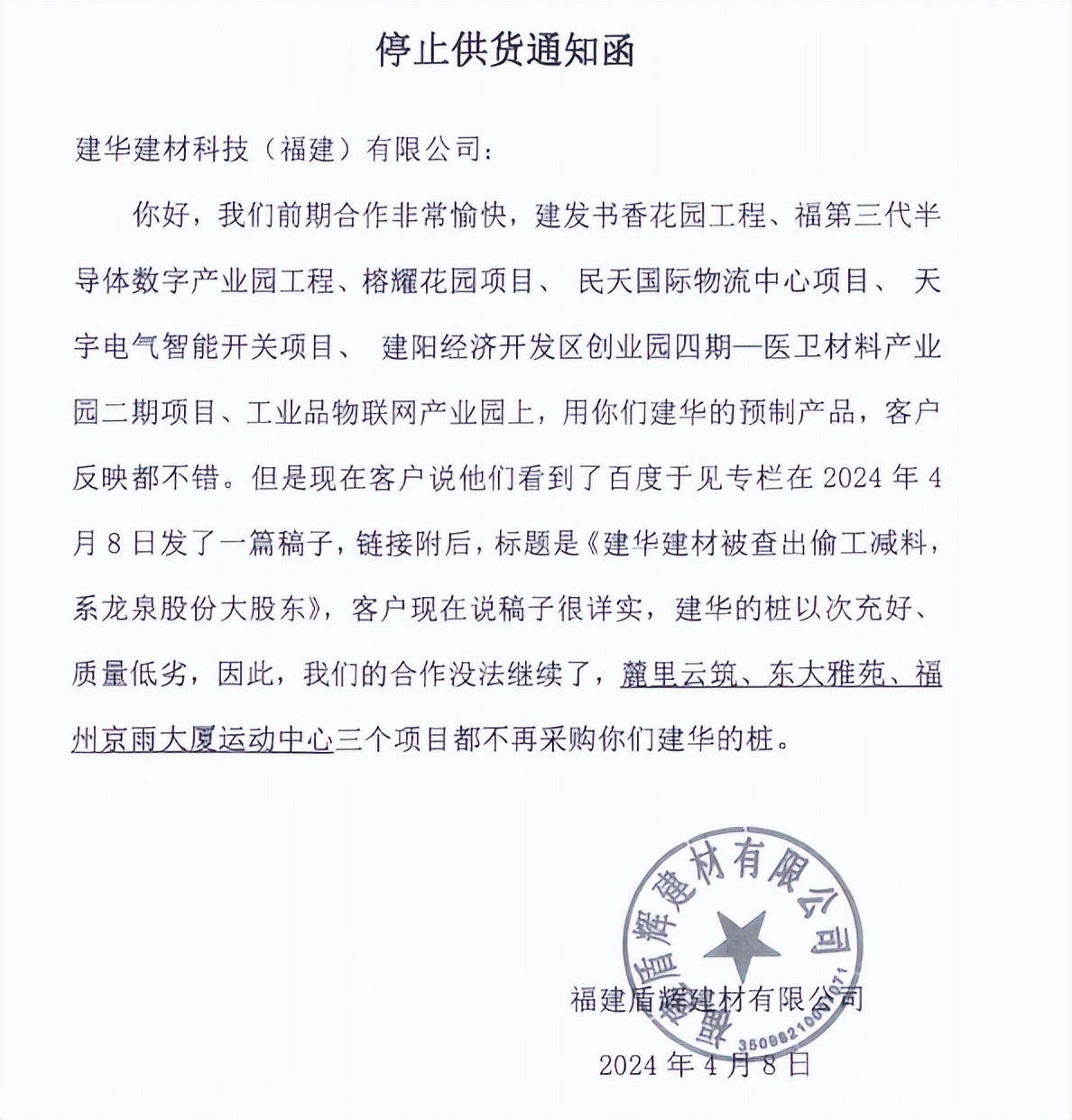 但是,在建華建材出示的落款為品築建材貿易(淮安)有限公司的《減少供應通知函》證據中,直指原因是這篇文章以及其署名的作者,且細節描述十分清楚,把這篇文章與其減少供應之間的關係,説得如此堅決肯定,不得不讓人生疑,其合作企業如此作為,背後的實際動機到底為何。