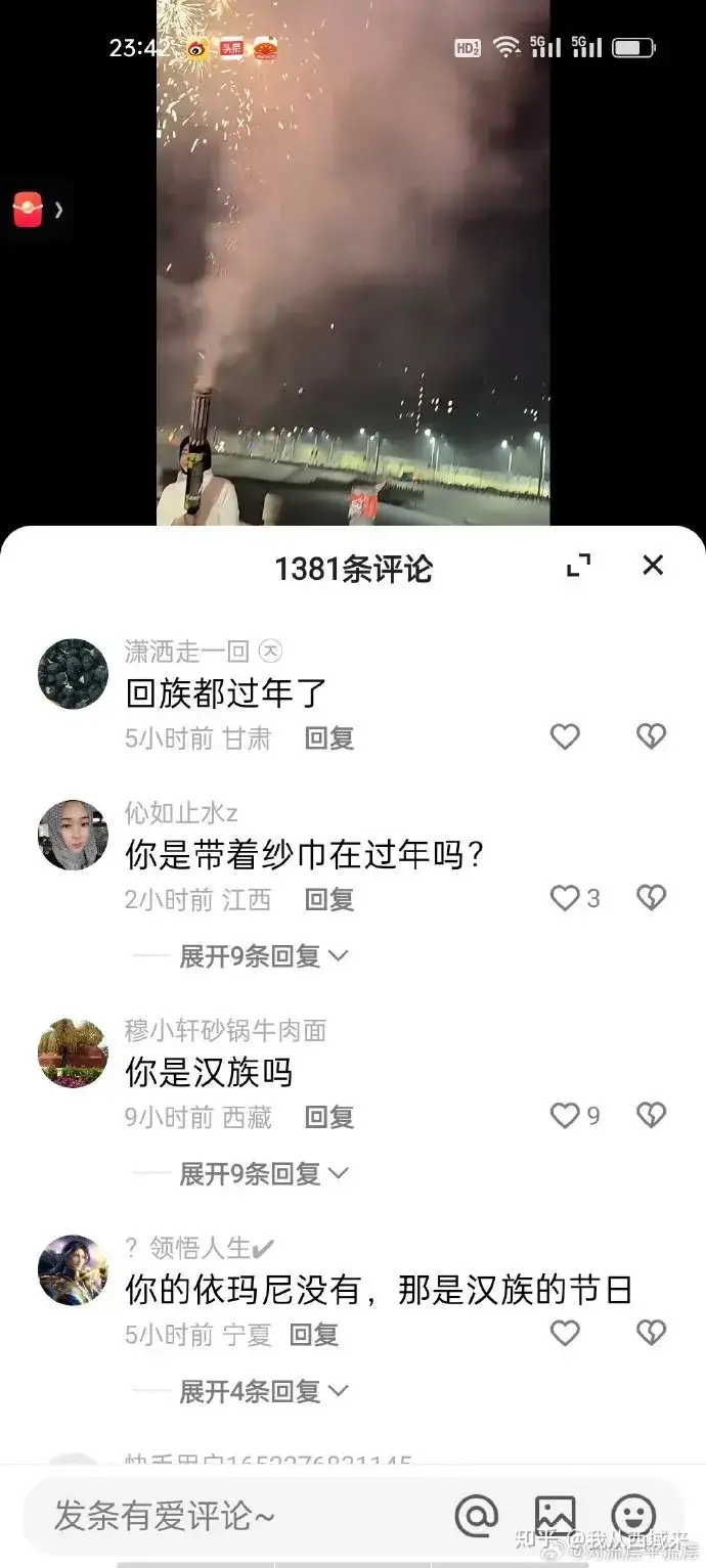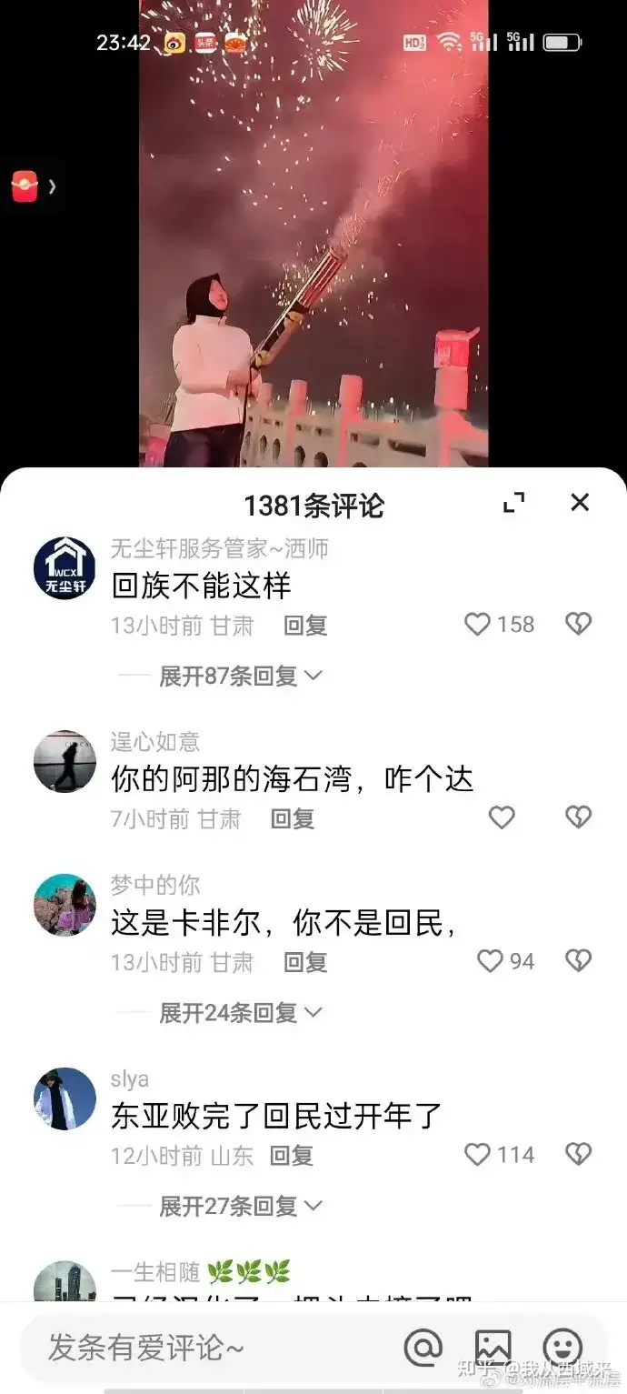 畫面中絢麗的火光映照着青年燦爛的笑容,評論區卻充斥着“卡非爾”、“那是漢族的節日”等批評。