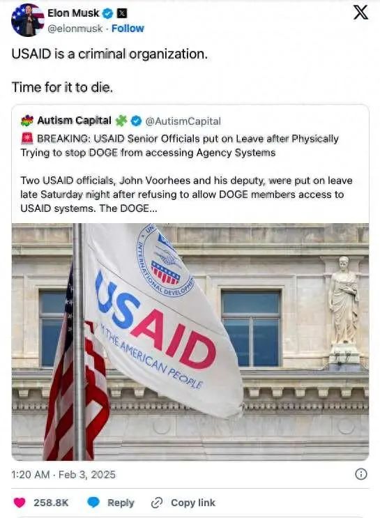 這幾天,特朗普又整事了。**2月3日,“政府效率部”(DOGE)主管馬斯克發帖稱,特朗普已同意關閉美國國際開發署(USAID)。**同一天,特朗普任命國務卿魯比奧為USAID代理署長,這意味着美國國際開發署(USAID)一下子從一個獨立機構變成美國國務院的下級部門,其預算將遭到大幅削減。另外,美國《華爾街日報》援引來自兩名熟悉內情人士的消息稱,美國中央情報局(CIA)於2月4日向其全體員工提出買斷,理由是為了使該機構與特朗普的優先事項保持一致。
