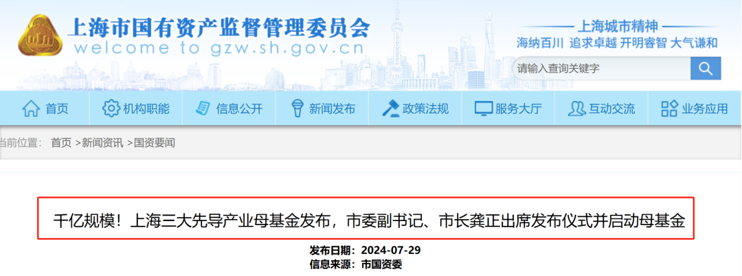 2024年7月上海正式發佈三大先導產業母基金(集成電路、生物醫藥、人工智能)及未來產業基金,總規模達到1000億元