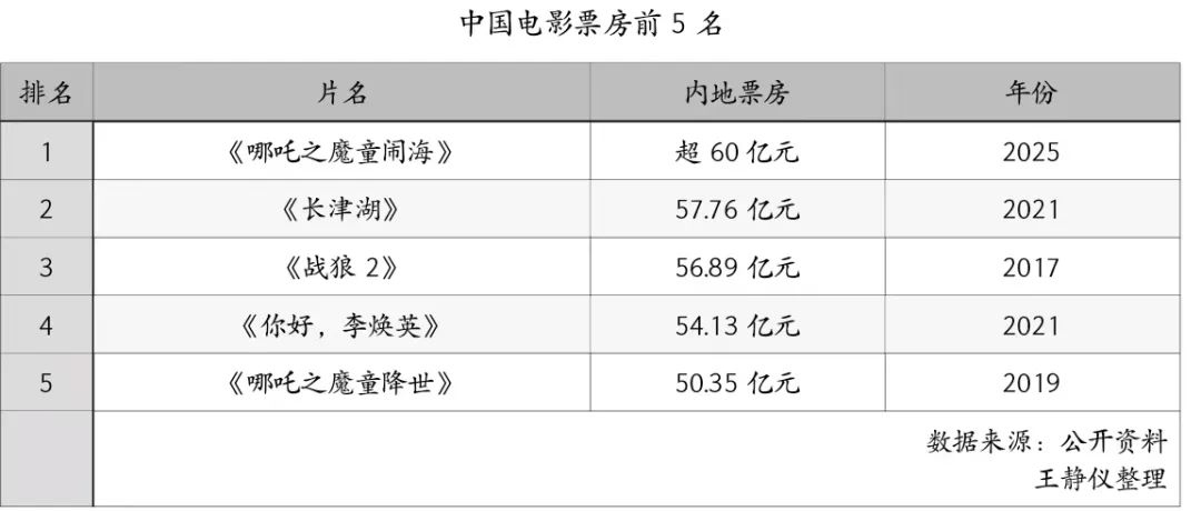 2025年2月6日,《哪吒之魔童鬧海》票房突破60億元,超越電影《長津湖》,登頂中國電影票房冠軍,並且還在衝擊更高票房數字,有望達到百億元。