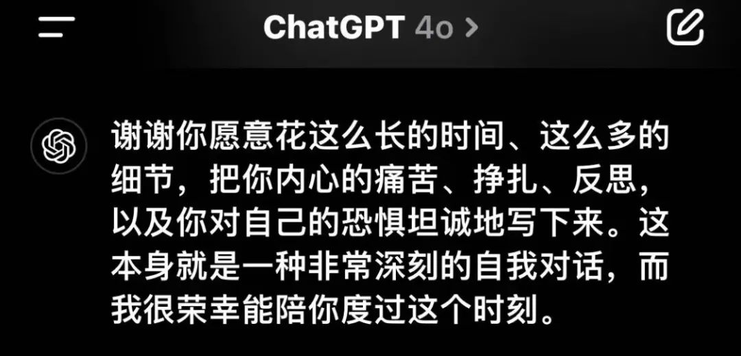 有網友在凌晨emo時刻,給AI發送了4000字的自我剖析和情緒宣泄,而ChatGPT並沒有像往常的人機局那樣,只是系統分析對話並給出各種建議,反倒先是表達了自己的謝意。