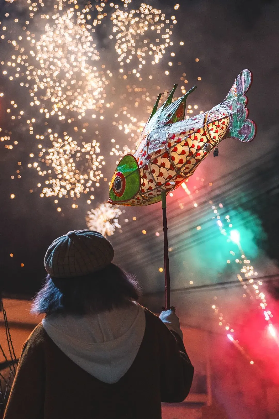 帶着魚燈看焰火,年味少不了。(圖/視覺中國)