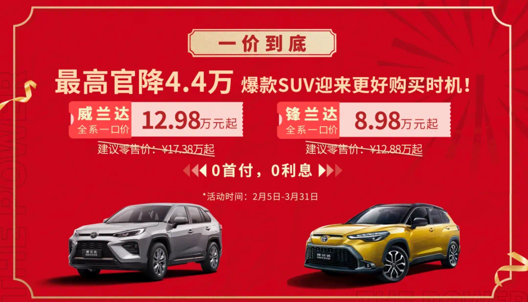 2月5日,廣汽豐田搞了個“一口價”政策,即截至3月31日,豐田旗下兩款SUV鋒蘭達和威蘭達直接一口價8.98萬元和12.98萬元起,最高降價4.4萬元。
