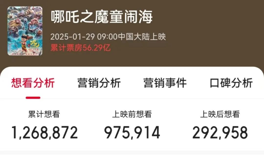 預排片上,對比同檔期電影,燈塔專業版顯示,《哪吒之魔童鬧海》的排片率較同檔期其他影片平均低5%,宣發團隊據此及時調整宣傳策略,突出影片精良的製作和深刻的主題,使得影片的口碑持續發酵,“想看”人數持續增長,最終在排片率上實現了反超。
