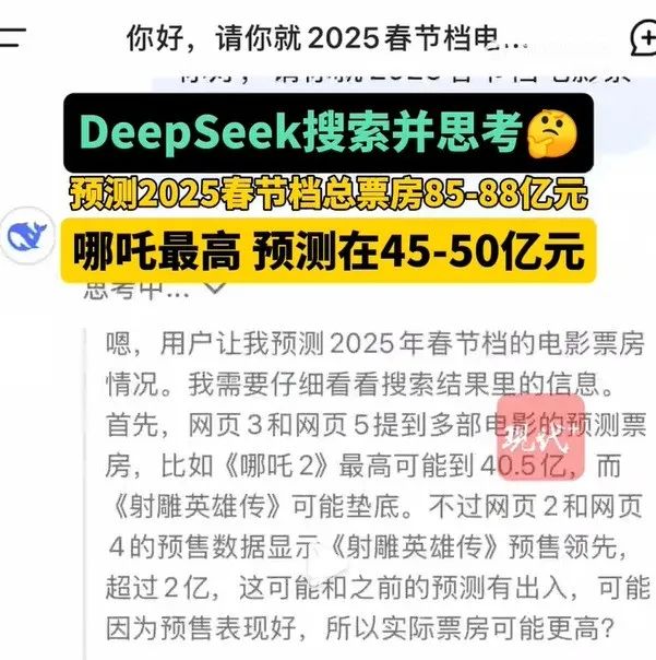 春節檔大戰之前,DeepSeek經過了13秒的深思熟慮,便斷定票房冠軍是《哪吒之魔童鬧海》,票房將超過45億。