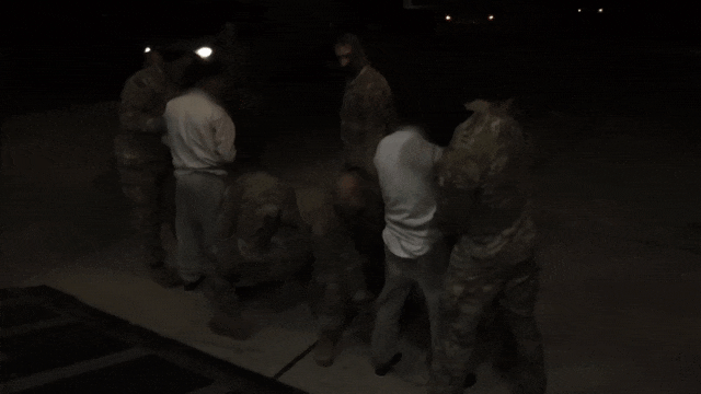 這張GIF圖畫面來源於美國國防部長皮特·赫格塞思近日在社交媒體發佈的一段視頻,內容顯示首批非法移民抵達古巴關塔那摩的美國海軍基地。