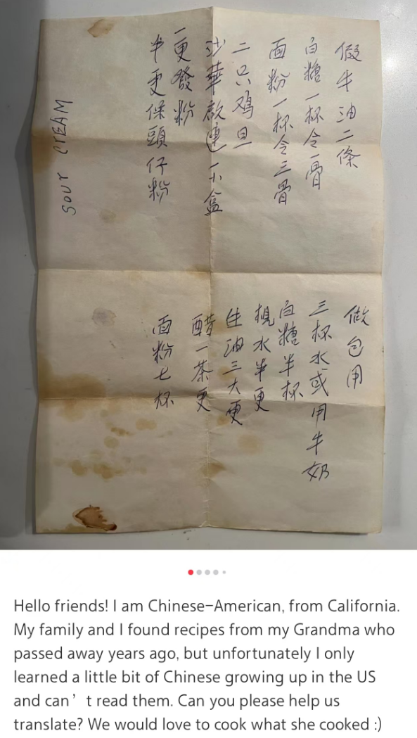 又或是下面這位,雖然不是來尋親的,但實在看不懂外婆留下來的神秘食譜,想復刻兒時的味道卻不知從何下手。