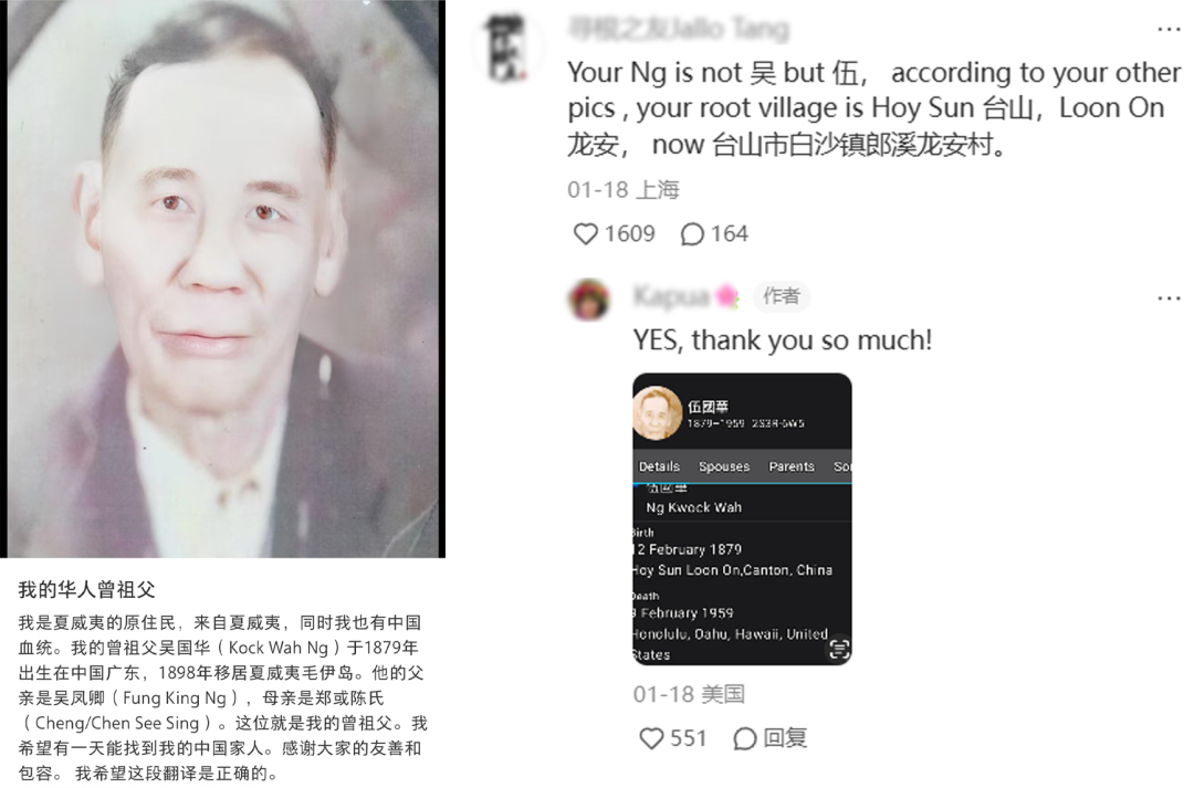 像下面這名在美國夏威夷的博主,只知道曾祖父“ 吳國華 ”出生於廣東,後移民夏威夷,對於其他方面則知之甚少。