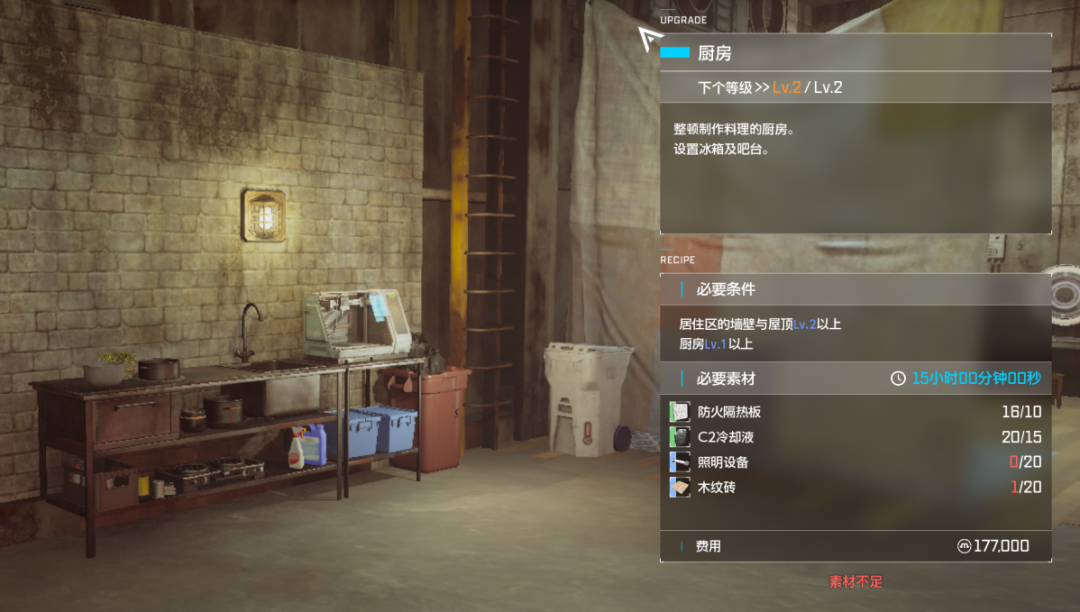 但基建也要計算成本,建造每座設施都需要上萬的金錢;中期的基建需要手搓藍色素材,搓素材也要花錢。以我心心念唸的2級廚房為例,它算是大後期基建,需要40種藍色素材,每種素材手搓需要3.1萬元;加上建設廚房本身所需的17.7萬元,共計141.7萬元。