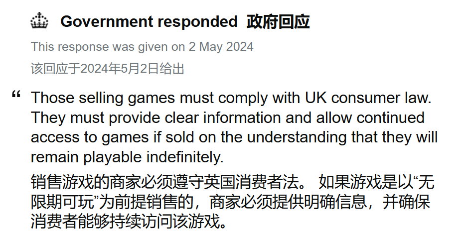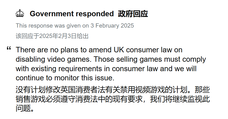 到了今年2月3日,英國玩家的第二份請願書終於得到了英國政府的回覆。好消息是,這一次的回覆不再是復讀消費者法,不過壞消息是,英國政府目前還沒有計劃修改法律來回應玩家訴求。