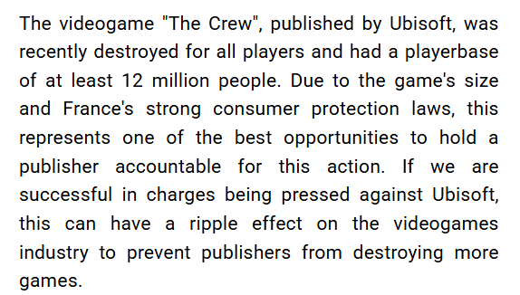 “如果我們成功地對育碧提起了訴訟,這可能會對整個電子遊戲行業產生連鎖反應,以阻止發行商摧毀更多的遊戲。”