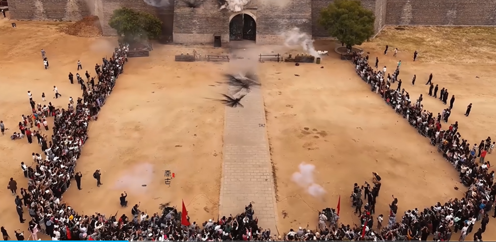 遊客們跟着景區的演員一起參戰,一邊向前衝鋒一邊大喊“殺啊!”“殺鬼子啦!”,一齊湧入城樓,沉浸式體驗一把八路軍戰士的感覺,城門樓外還真的就有“鬼子”和“偽軍”,當然也都是羣眾演員扮演的了。